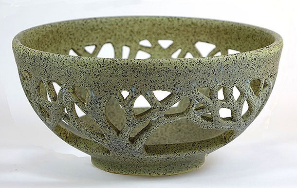 I wheel-throw a traditional vase-shaped vessel, then incise it, leaving open negative space. When a light or candle is inserted, the work fills with an inner glow and projects an intricate symmetrical shadow on the ceiling.