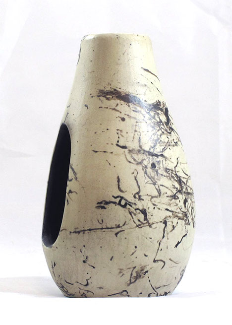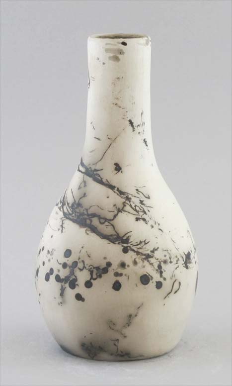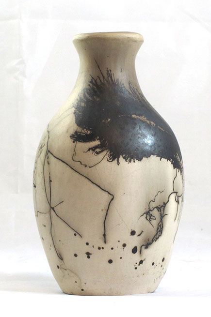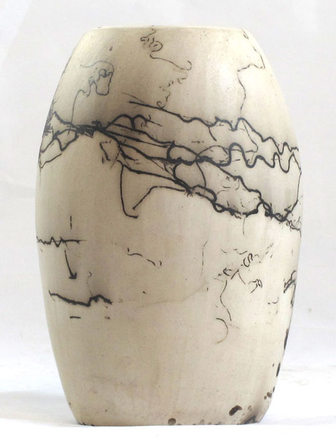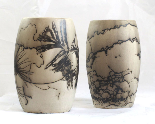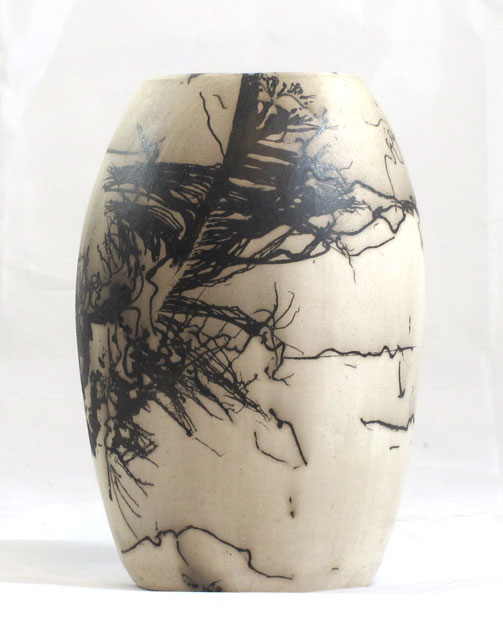 Immediately, I lay horse tail hair against the hot piece. It burns into the surface, leaving the brown-black lines of Horse Hair Ceramics.