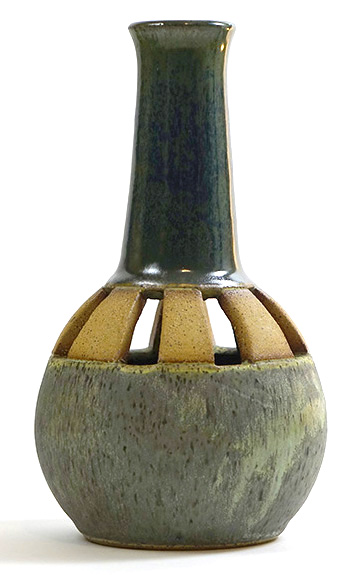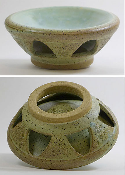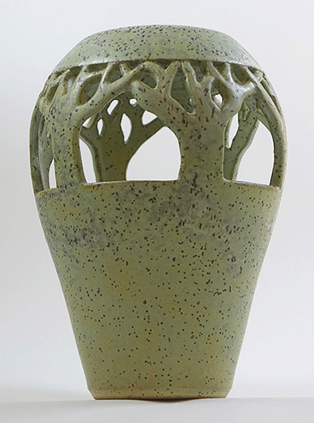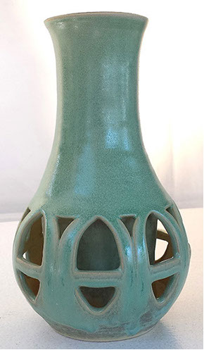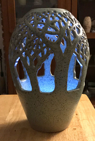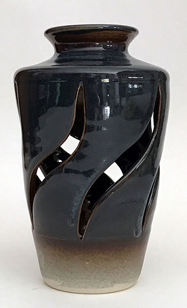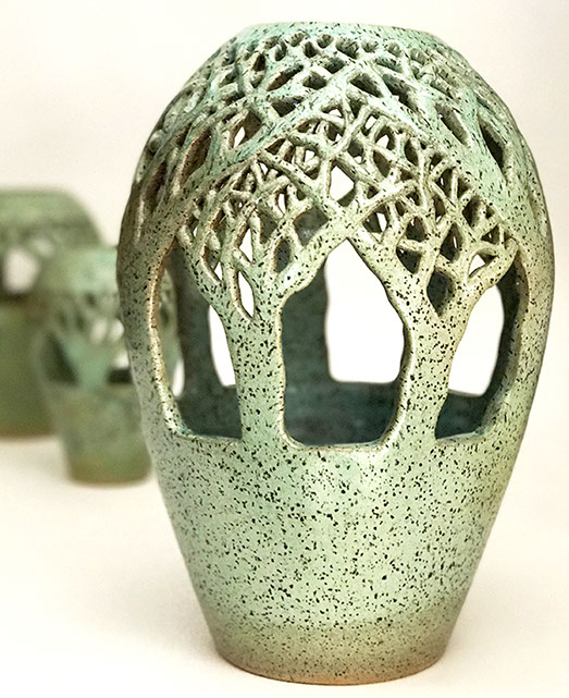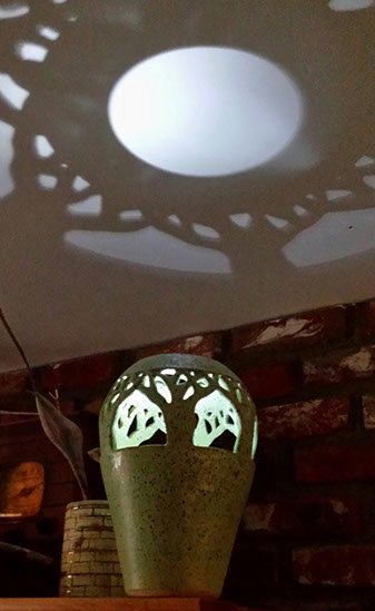 I wheel-throw a traditional vase-shaped vessel, then incise it, leaving open negative space. When a light or candle is inserted, the work fills with an inner glow and projects an intricate symmetrical shadow on the ceiling.