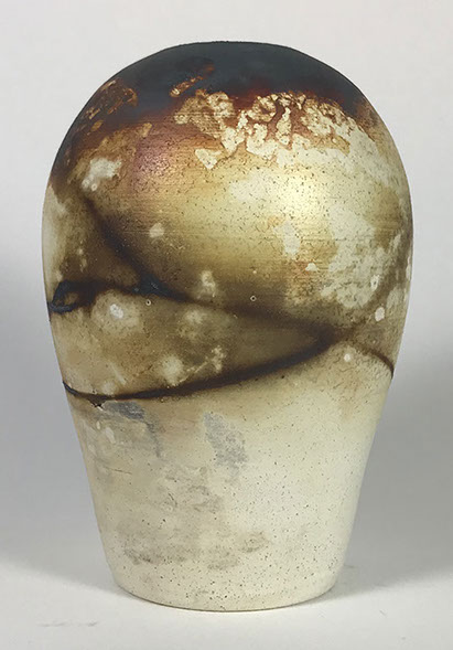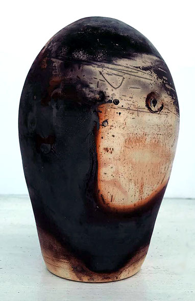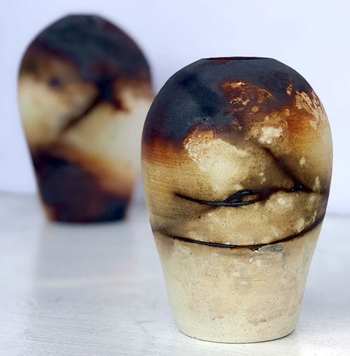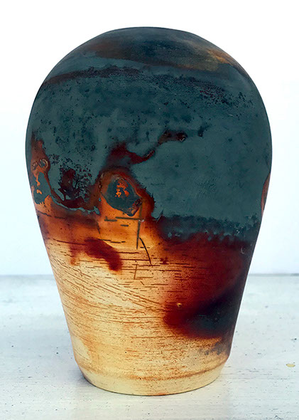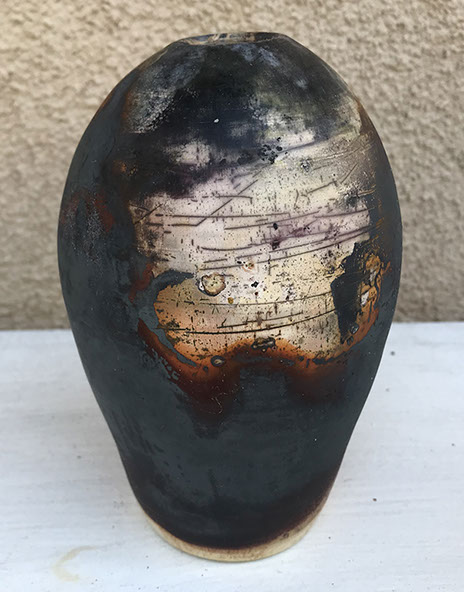 A Clay vessel fired in a container, tightly-filled with an assortment of combustible and non-combustible organic materials, salts, and metals -- for example: seaweed, steel wool, copper wire, saw dust, banana peel, iron nails, salt, boric acid, minerals -- that combine to create dramatic finishes.